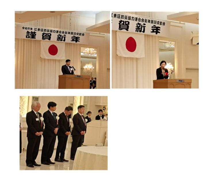 令和8年 江東区防災協力連合会 新年賀詞交歓会 「令和8年新年賀詞交歓会」を1月16日(金)午後12時より、アンフェリシオンにおいて開催いたしまいた。当日は江東区防災協力連合会 本会会員など約120名の方々がご出席され、大久保朋果 江東区長をはじめ、多数のご来賓の方々にご臨席いただきました。 新年早々ご多用のところ、ご出席いただきました皆さまには、厚く御礼申し上げます。